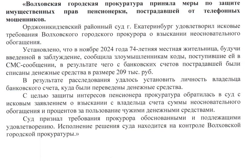 Волховская городская прокуратура приняла меры по защите имущественных прав пенсионерки, пострадавшей от телефонных мошенников Опубликовано 20.01.2026 в рубрике Информация, Прокуратура